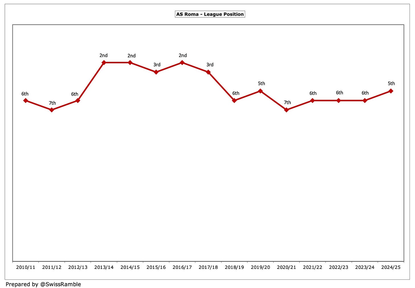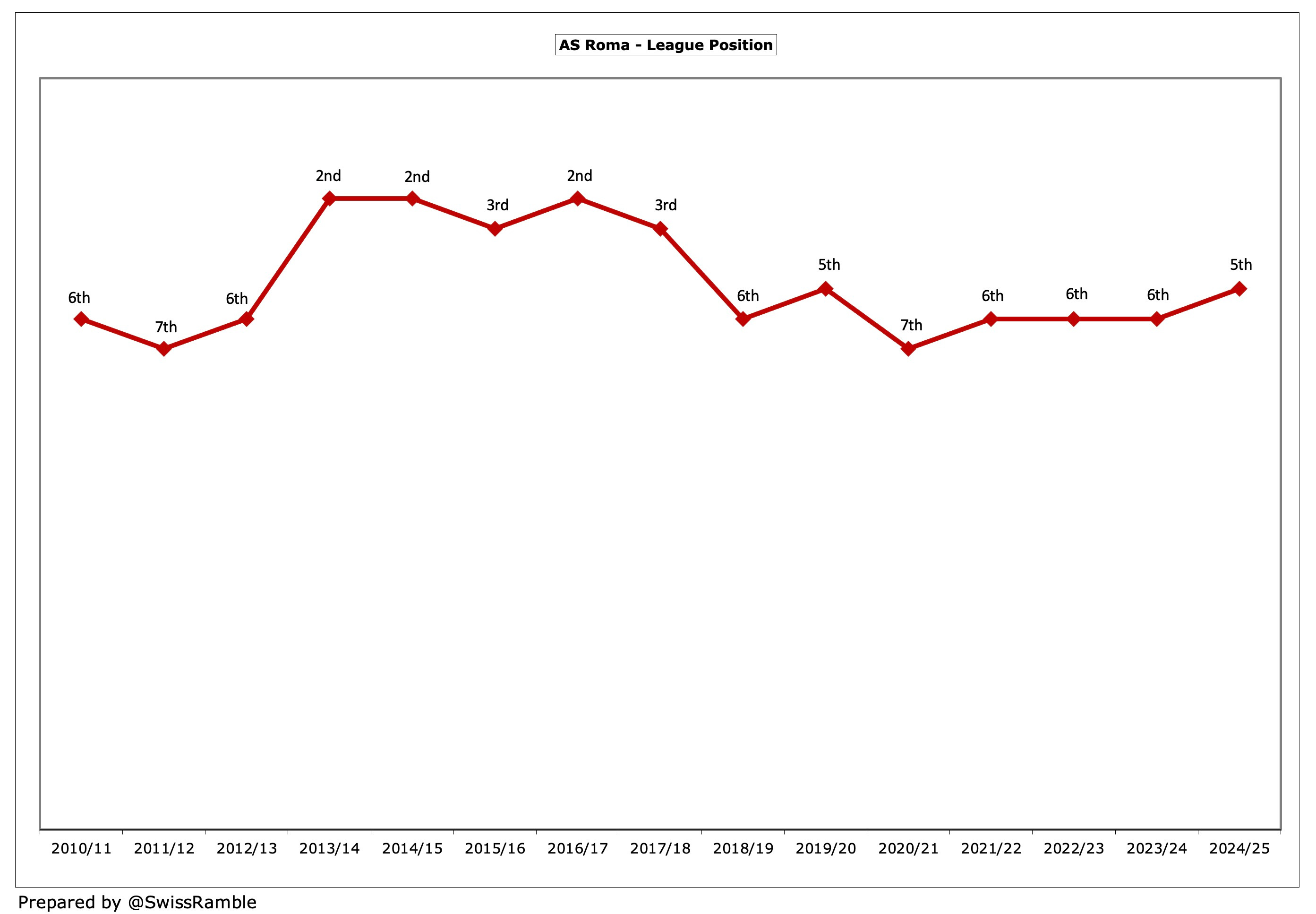 Despite all this upheaval, Roma have been fairly consistent in in the league, finishing between 5th and 7th in each of the last seven seasons. That’s not too bad, but it does represent a decline in performance, as Roma had finished between 2nd and 3rd in the preceding five seasons.