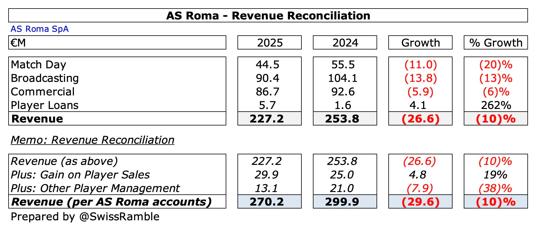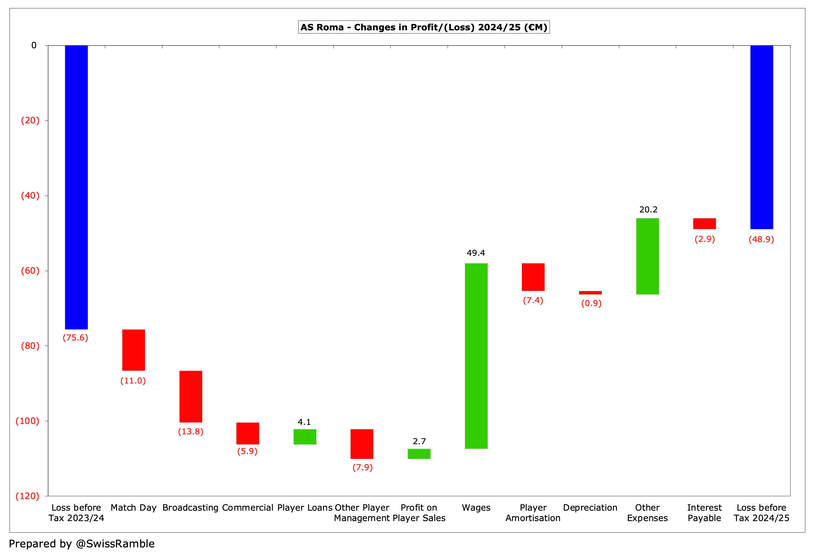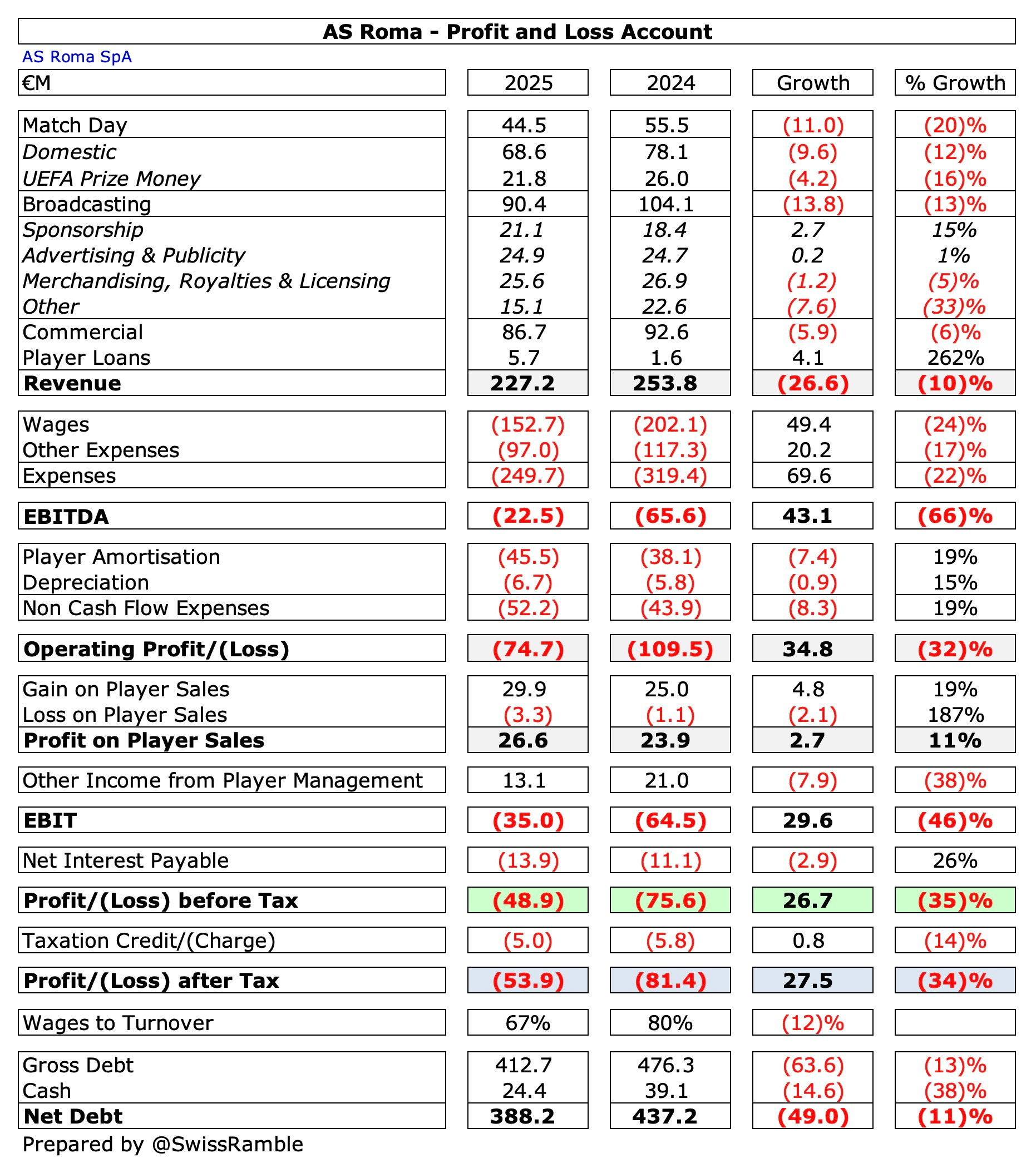 Roma’s 2024/25 accounts covered a season when they finished fifth in Serie A, their best result for five years, though they once again missed out on qualification for the Champions League.
