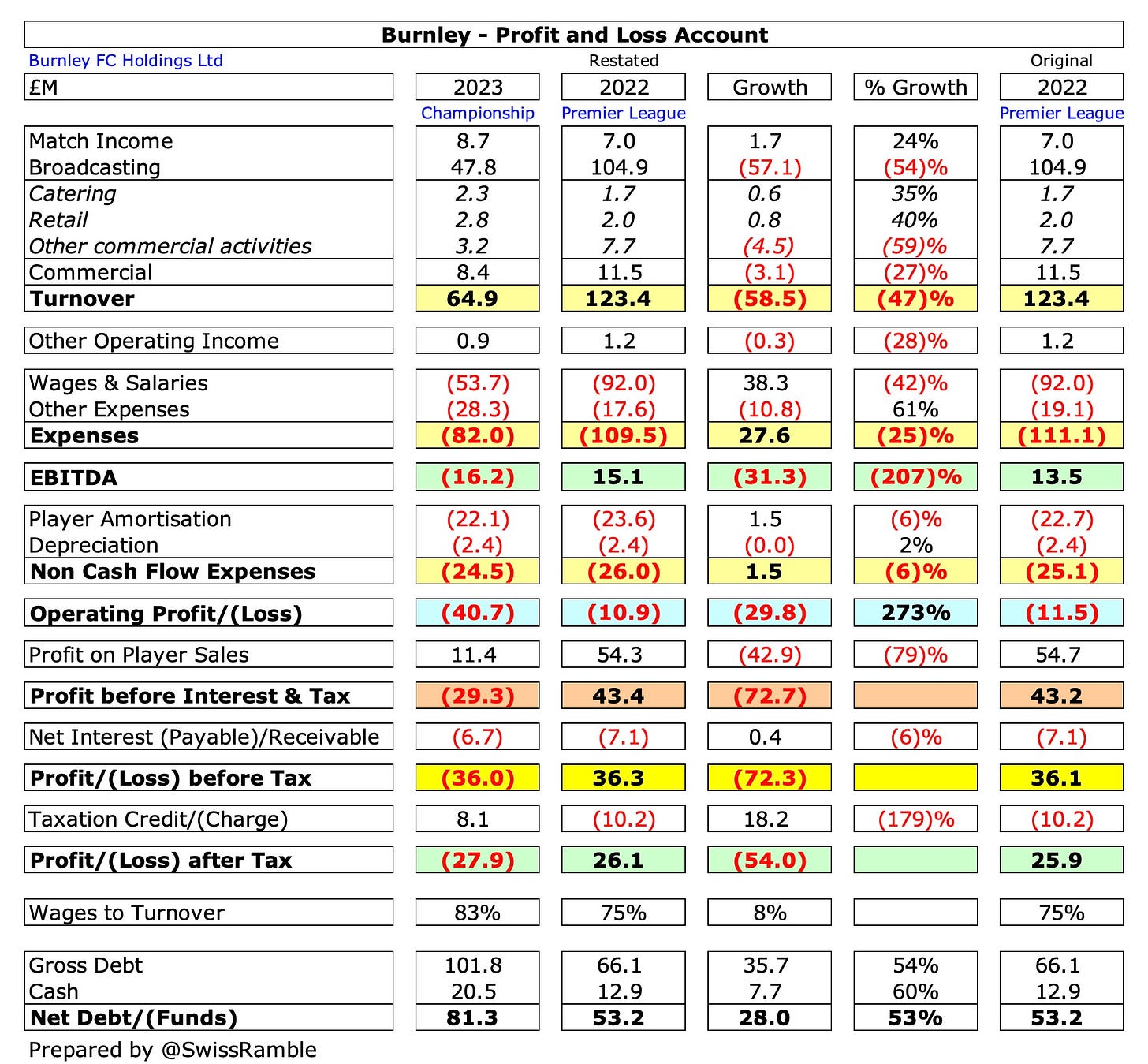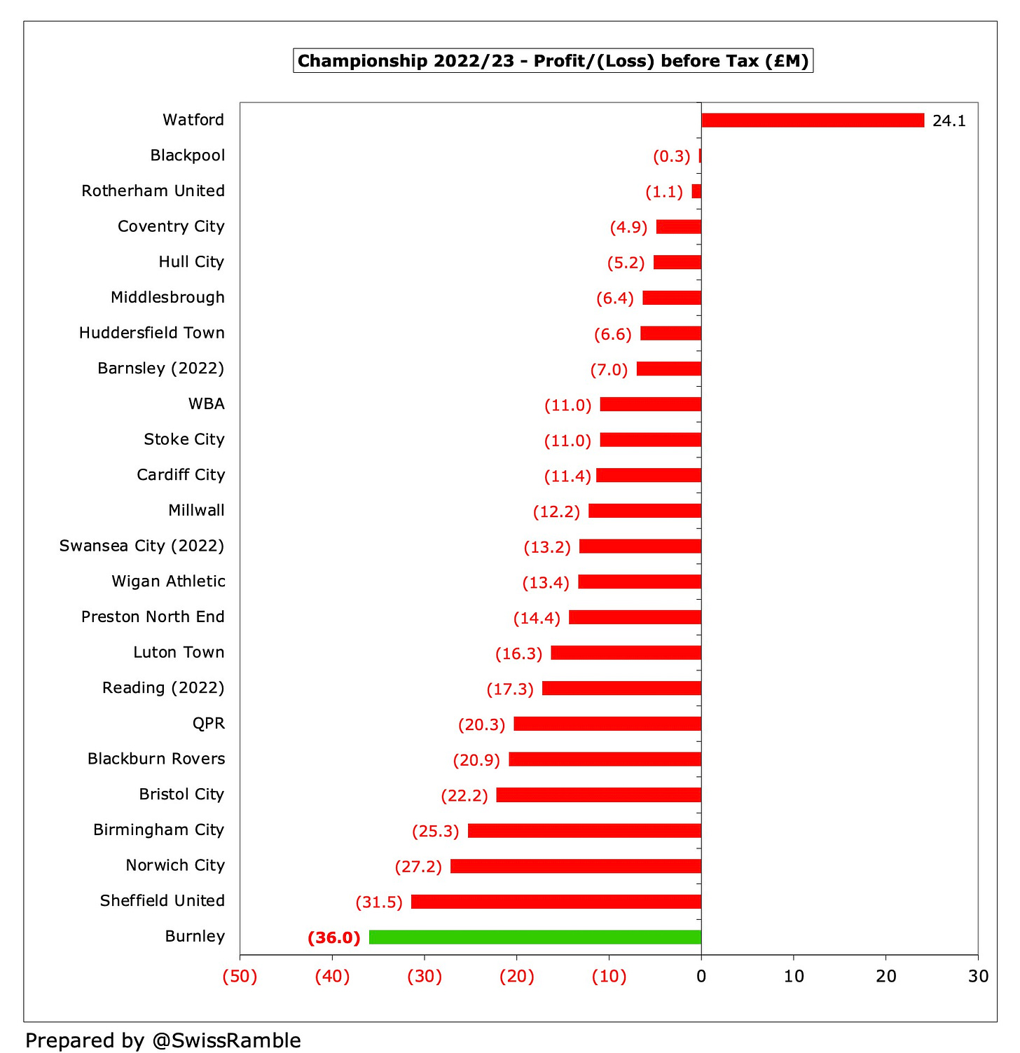 Burnley’s £36m loss before tax was actually the worst financial performance in the 2022/23 Championship, more than Sheffield United £31m, Norwich City £27m and Birmingham City £25m.