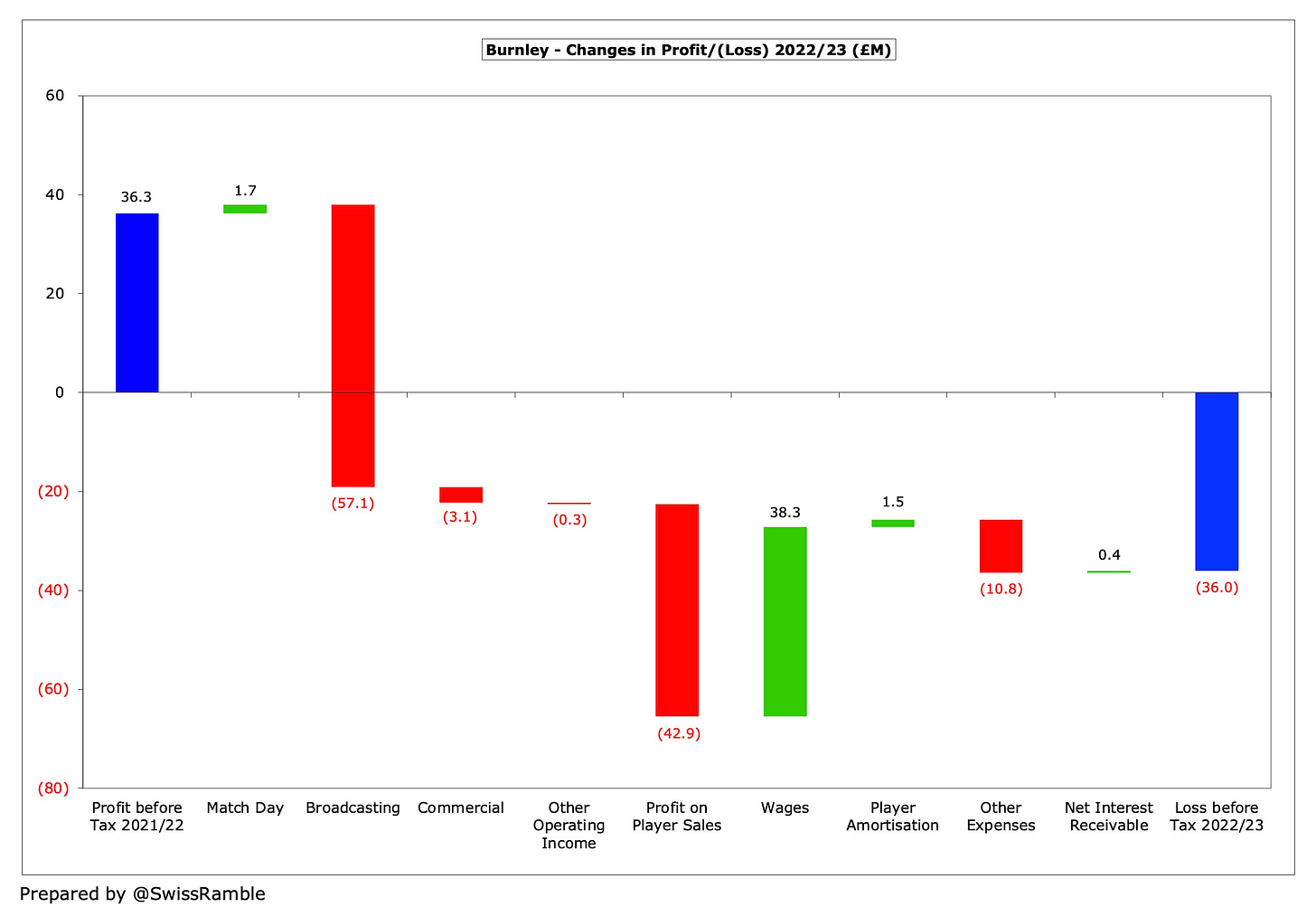 Following relegation to the Championship, Burnley swung from a pre-tax £36m profit to a £36m loss, a £72m year-on-year decline, as revenue fell £58m (47%) from £123m to £65m and profit from player sales dropped £43m from £54m to £11m. This was partly offset by the club cutting expenses by £29m (1%) to £106m.