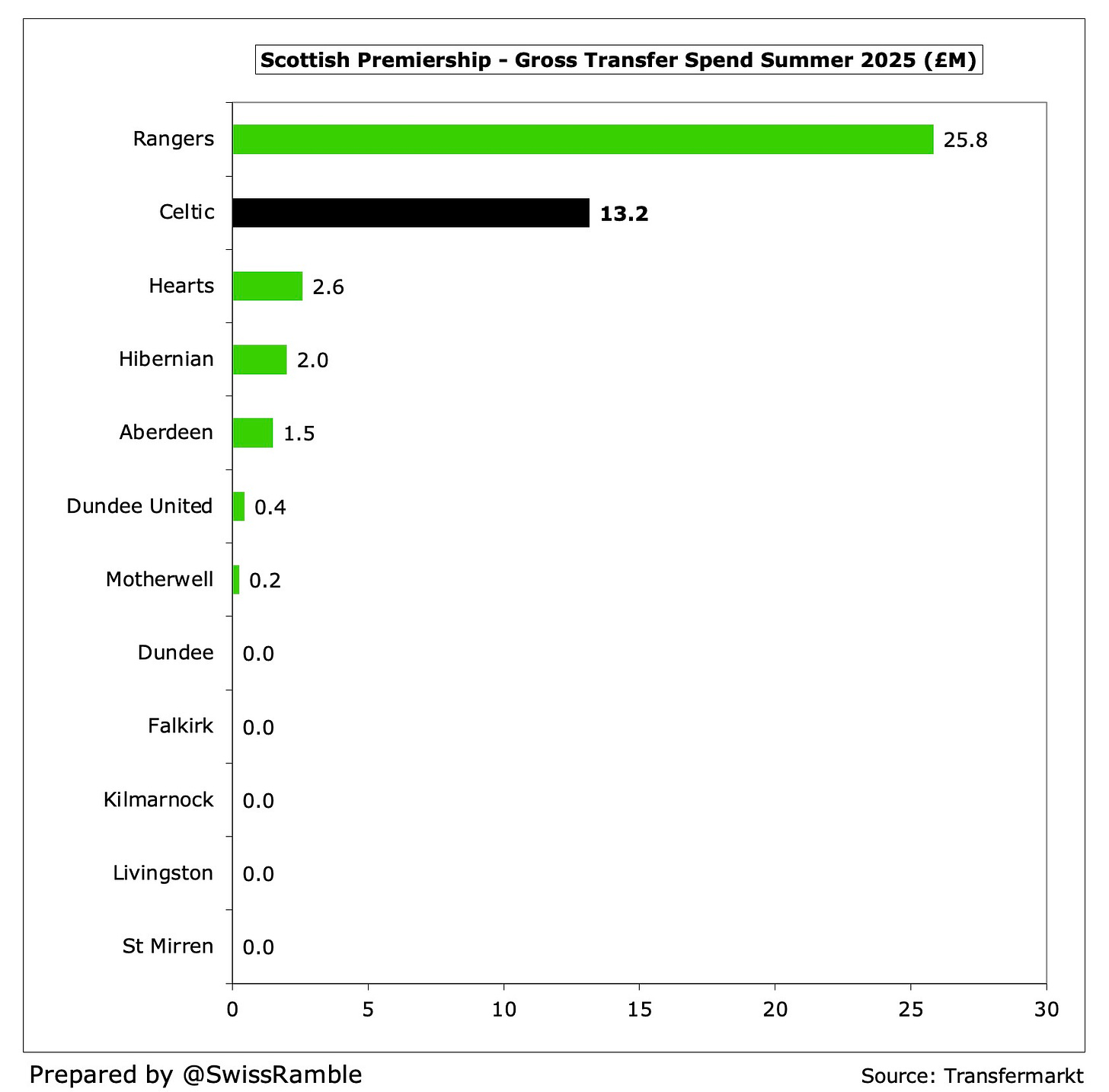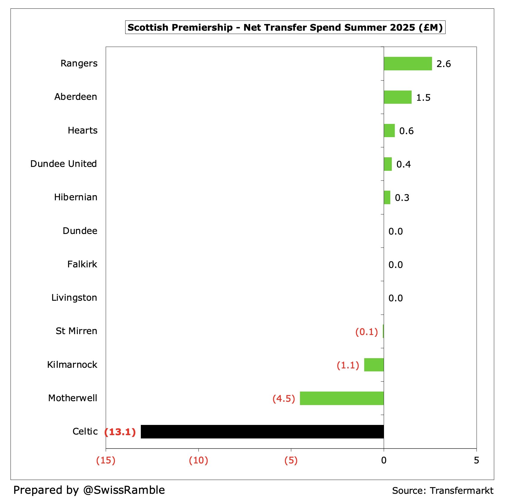 In fact, Celtic actually made a profit on player trading this summer, as they sold £26m of talent to give net sales of £13m, by far the largest in Scotland.