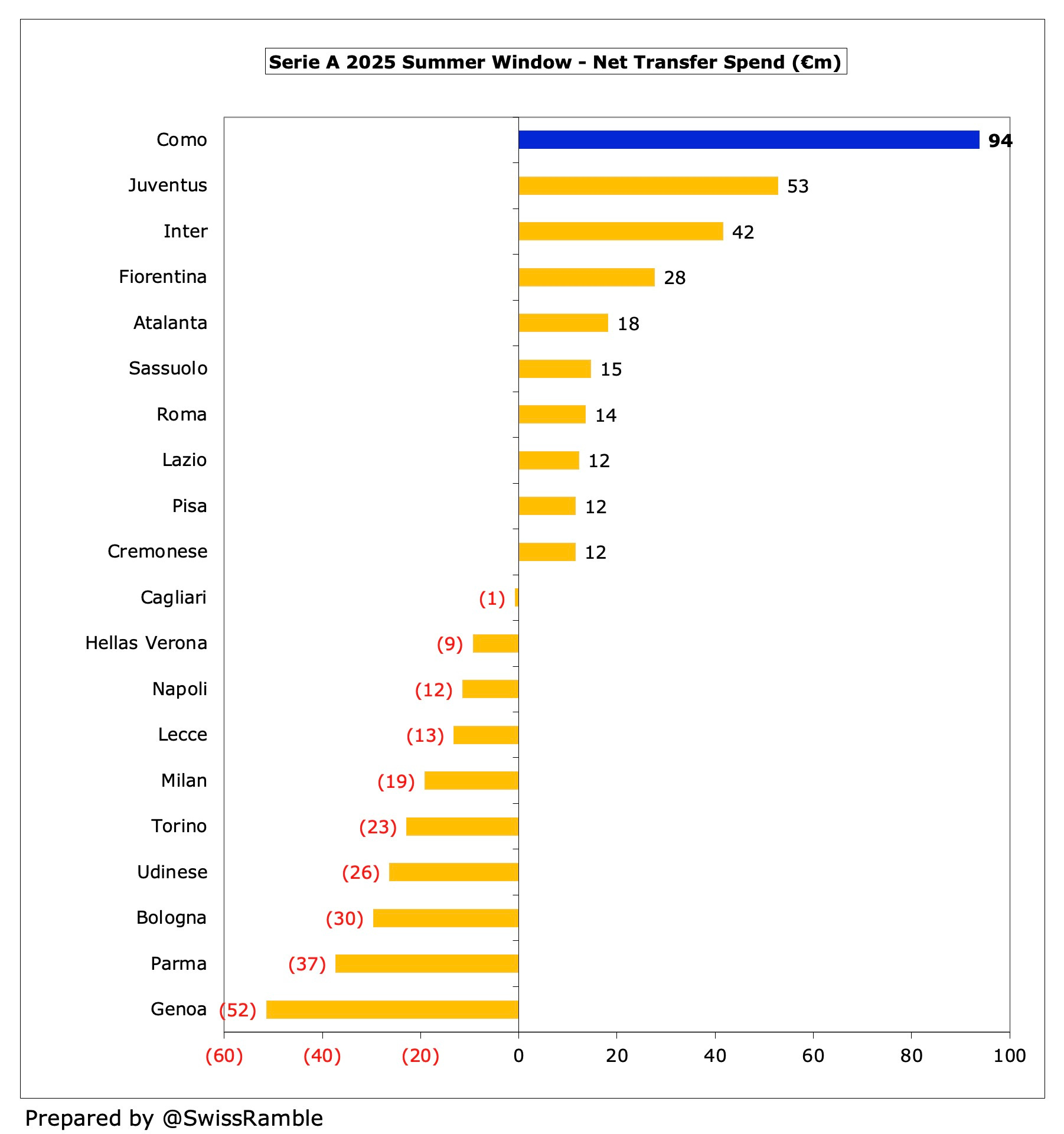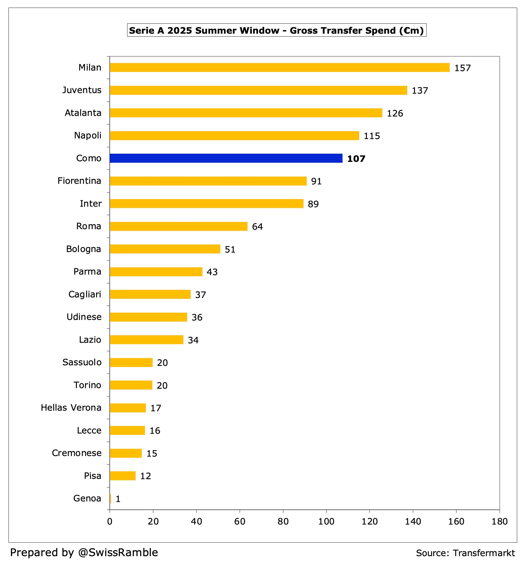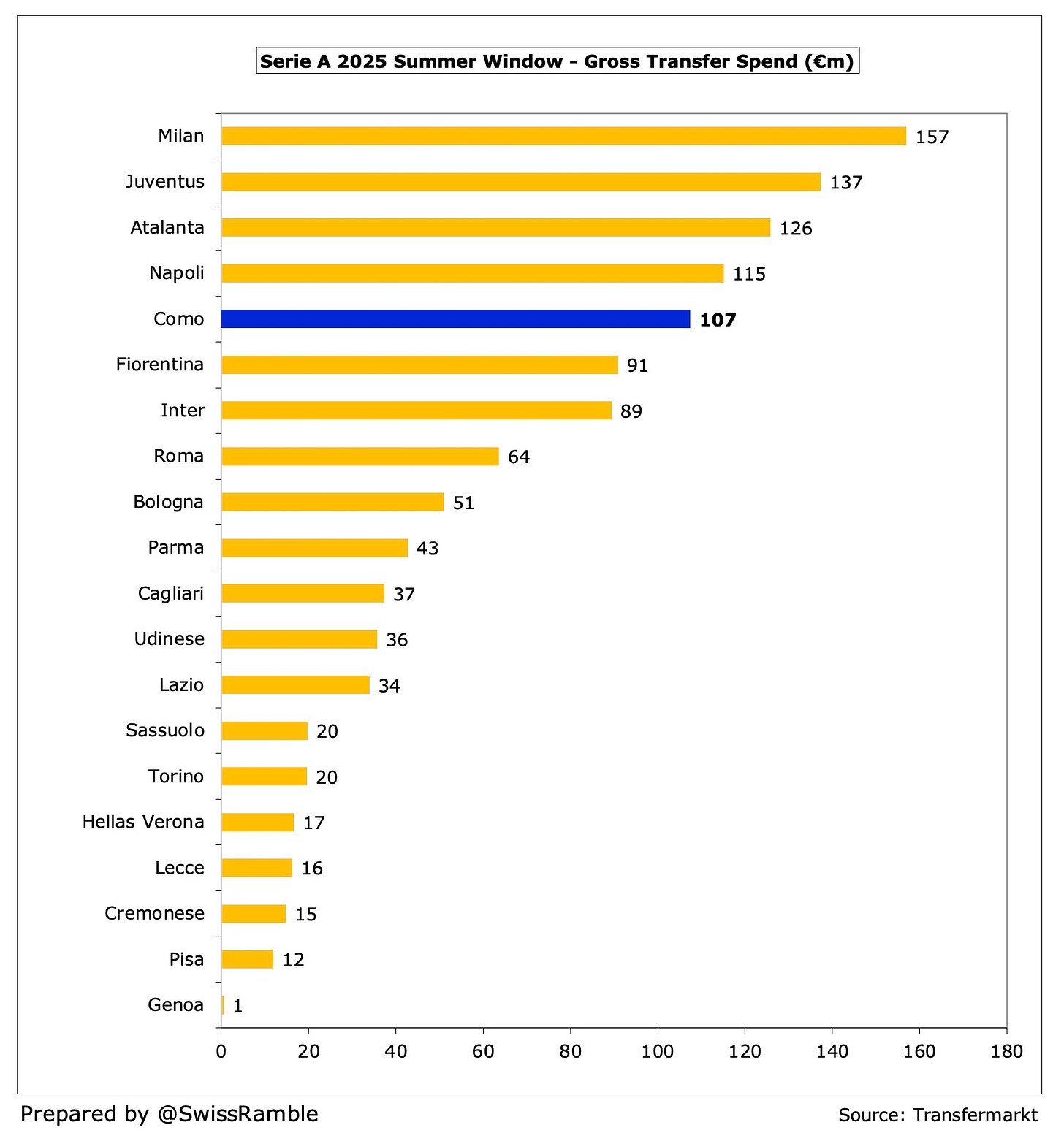 According to Transfermarkt, this was the fifth highest gross spend in Serie A, only surpassed by Milan €157m, Juventus €137m, Atalanta €126m and Napoli €115m.