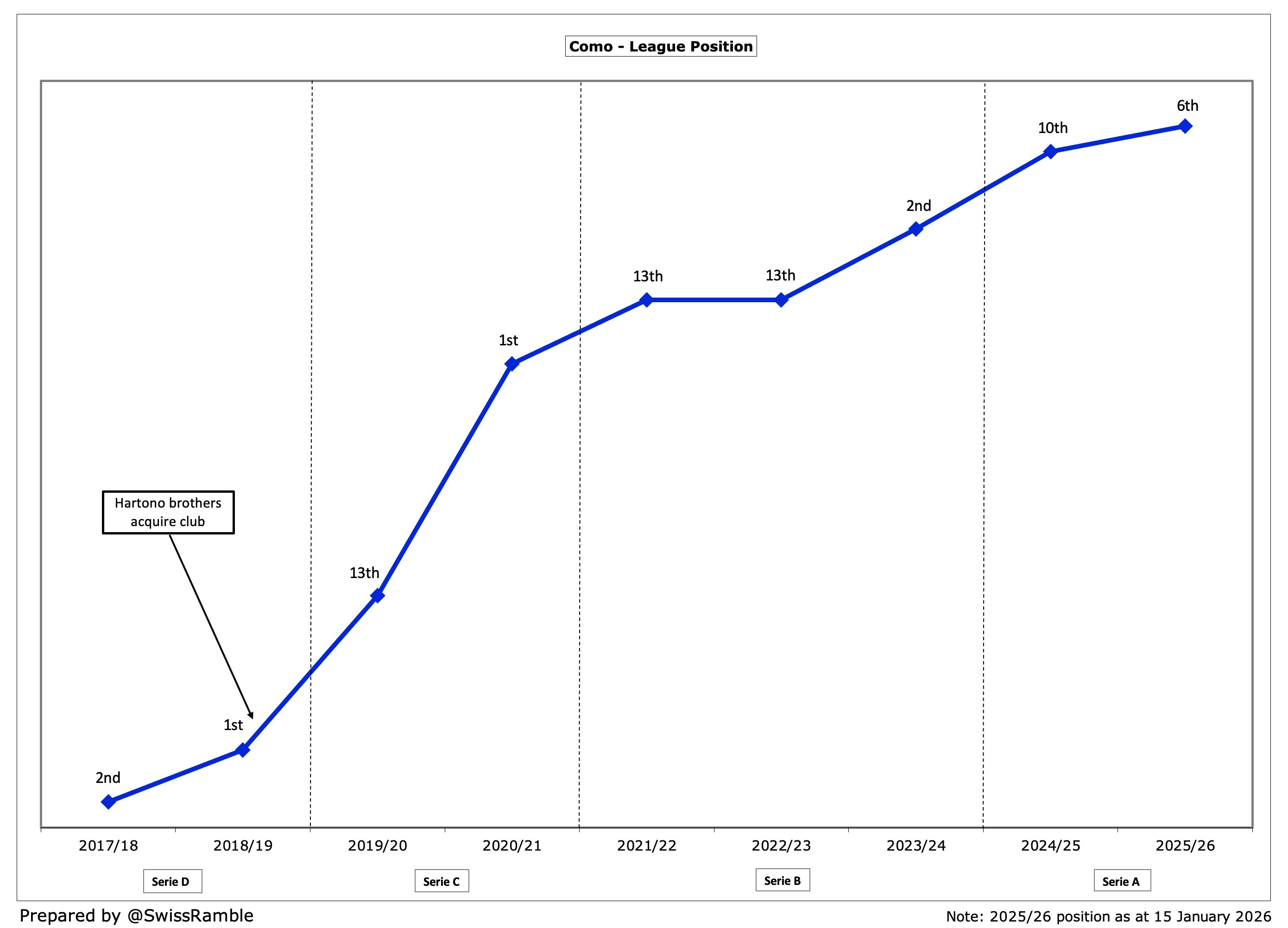 One of the big football stories in Italy has been the rise of Como as they returned to Serie A after a 21-year absence, finishing in a very creditable 10th place in their first season back in 2024/25. To date, this season has been even more promising, as they are currently in 6th place, very much involved in the race for European qualification.