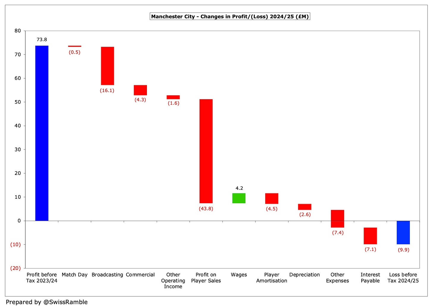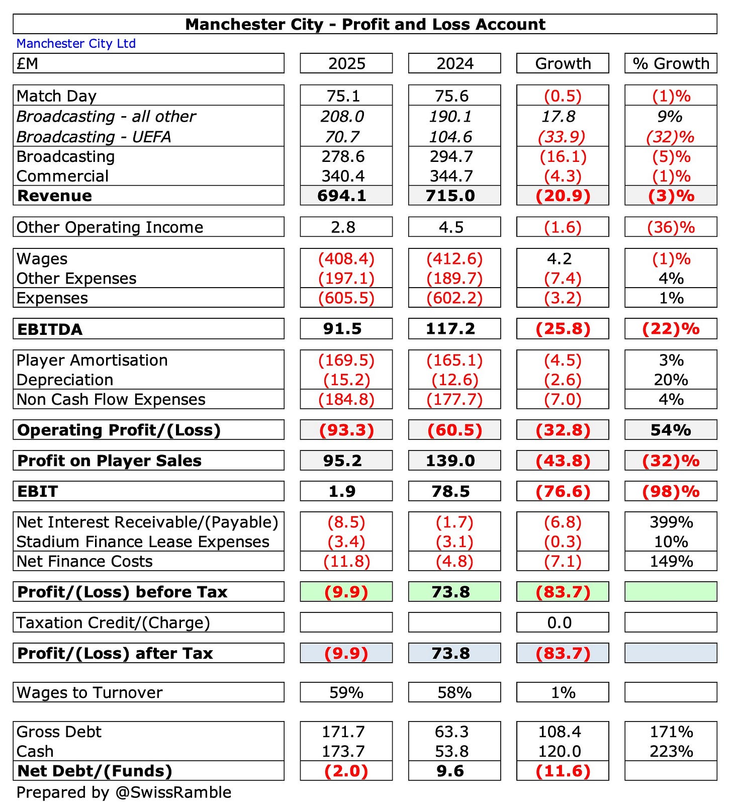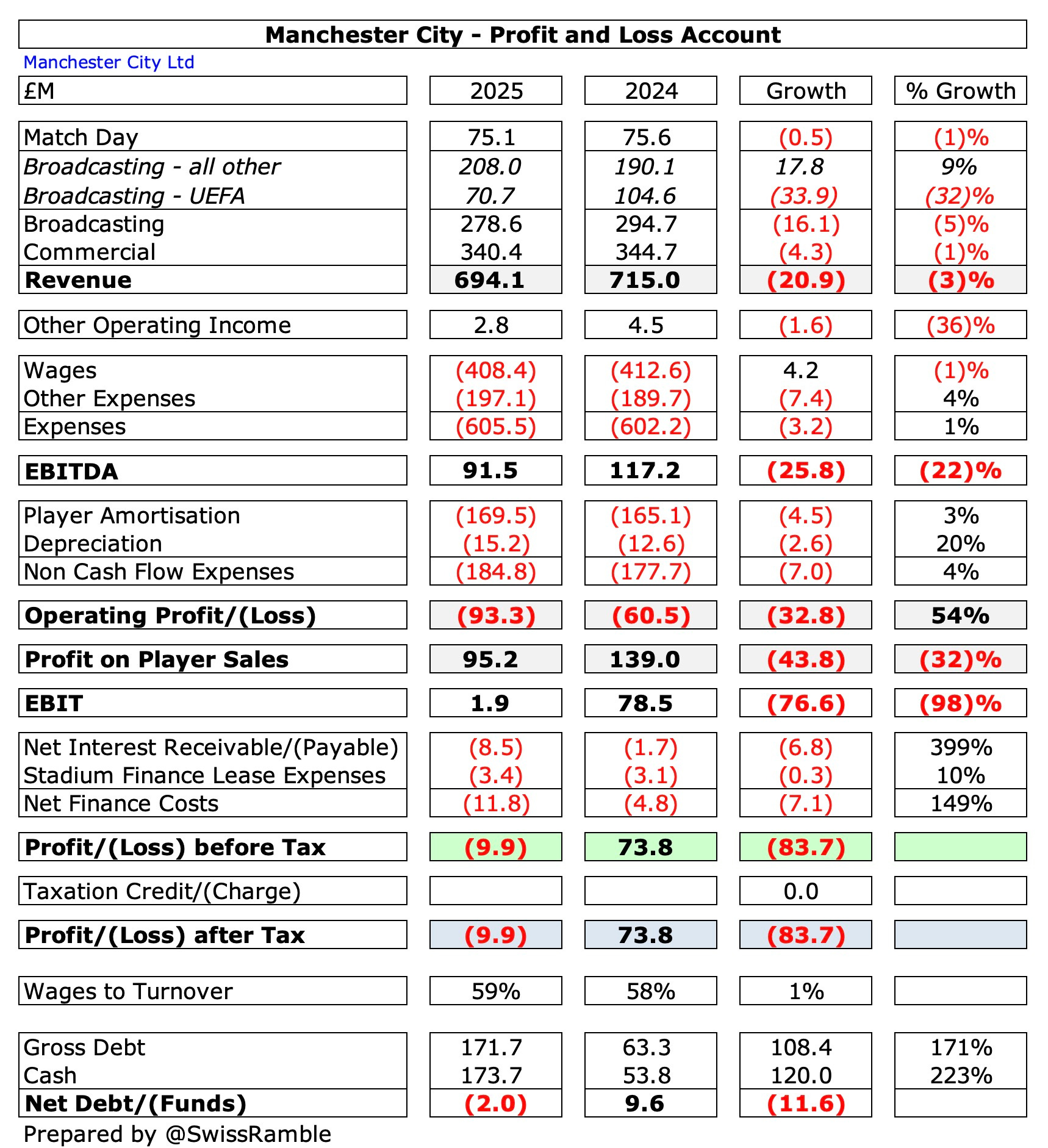 Revenue also fell £21m (3%) from a club record £715m to £694m, exacerbated by a £10m (1%) increase in operating expenses from £780m to £790m, while net finance costs more than doubled from £5m to £12m.