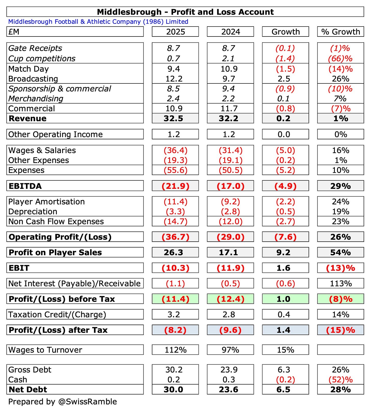 In fact, Middlesbrough’s £11.4m loss was actually one of the better results, compared to some of the hefty losses reported elsewhere, e.g. Cardiff City £35m, Coventry City £22m and Norwich City £21m, though Millwall’s loss was just £0.3m.