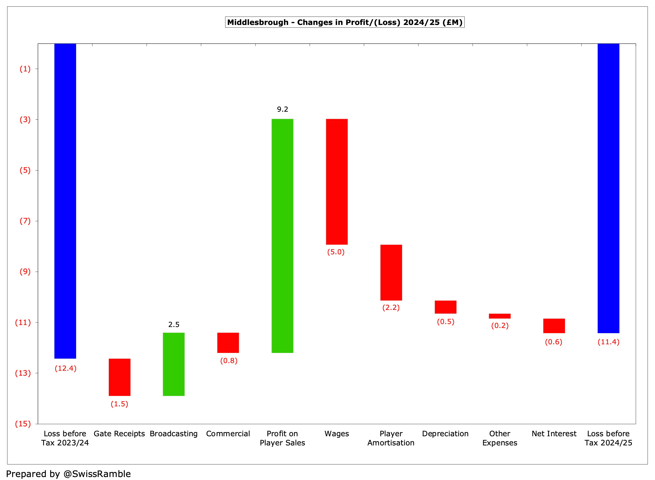 Middlesbrough’s pre-tax loss slightly reduced from £12.4m to £11.4m, thanks to profit from player sales improving by £9.2m from £17.1m to £26.3m.