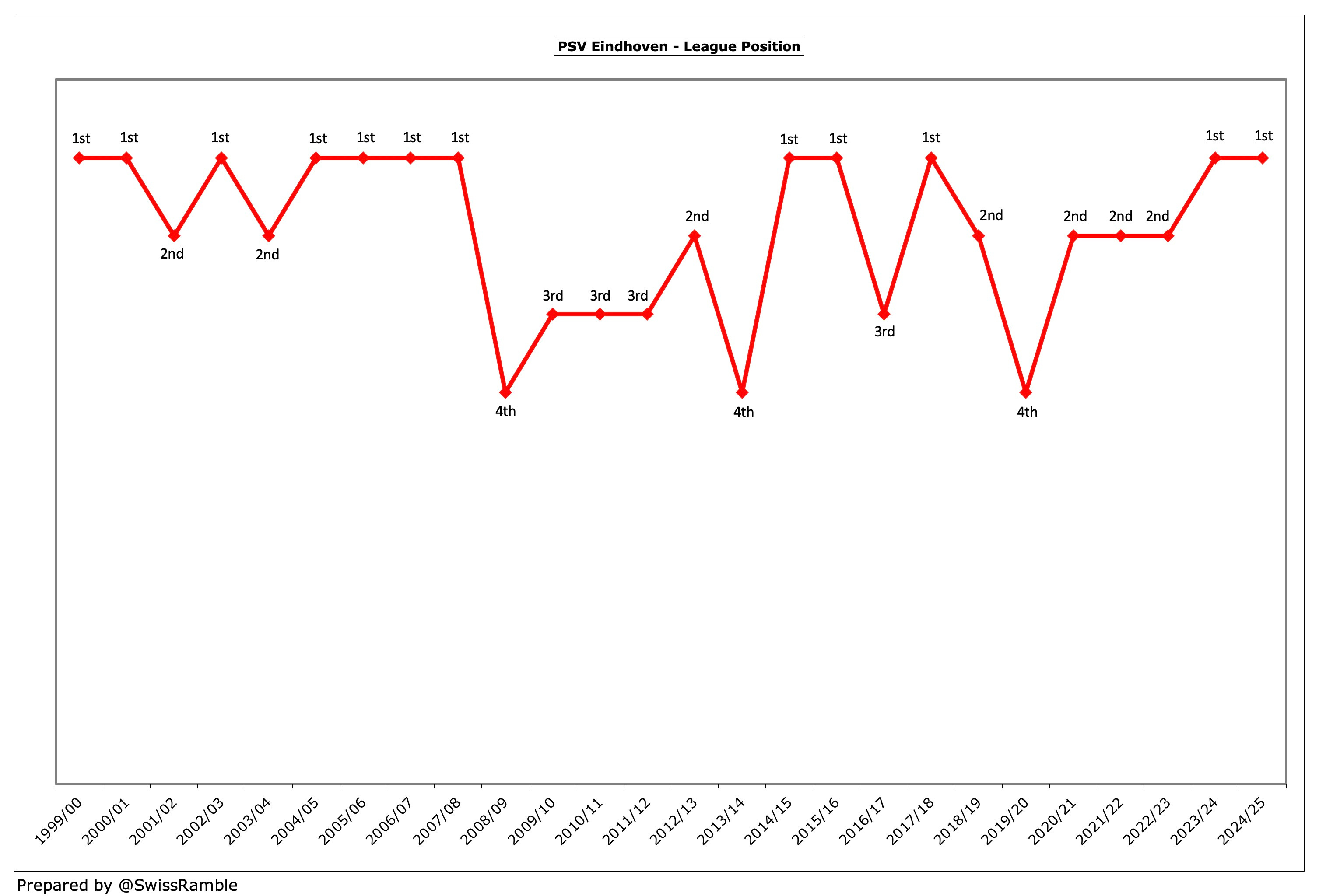 Domestically, it’s been a very different story after the recent upsurge in fortunes. PSV had won the league three times in the four seasons up to 2017/18, but then finished as runners-up four times in the next five seasons, before the current purple patch.