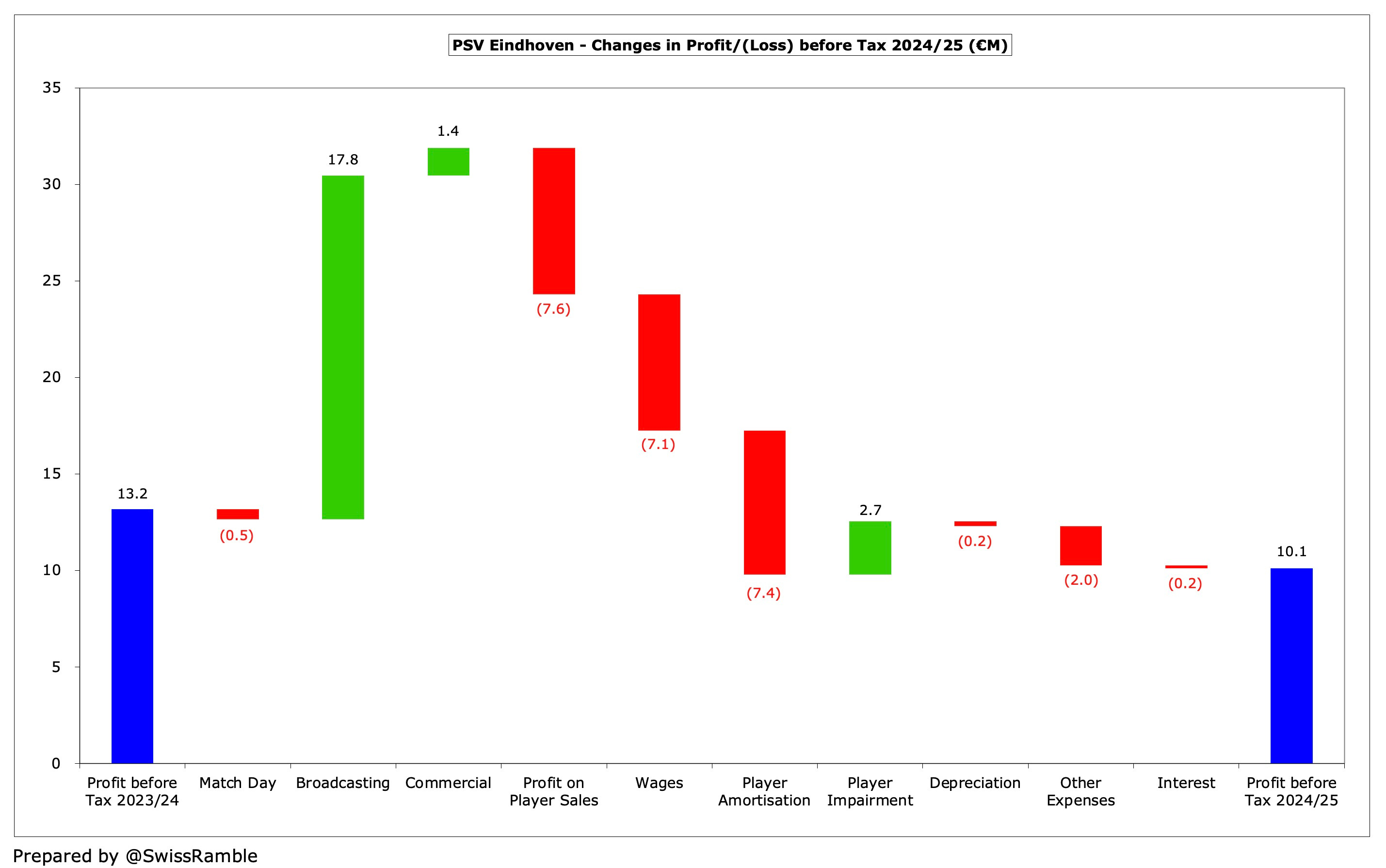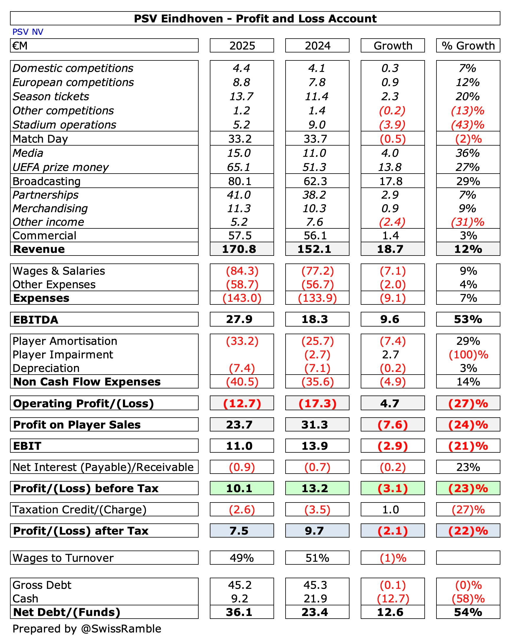 PSV’s revenue growth was almost entirely driven by TV money from the Champions League, leading to a steep increase in broadcasting income, which rose €17.8m (29%) from €62.3m to €80.1m.